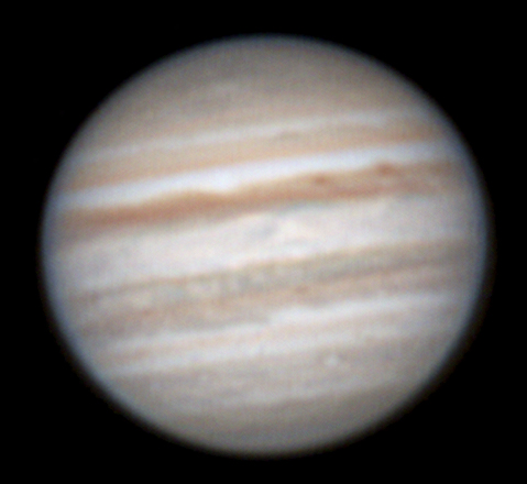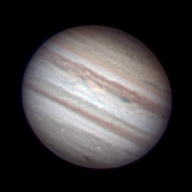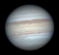 Features: Io and its shadow transiting, plus the GRS disappearing on the right side Telescope: Celestron CPC 800 (8") Barlow: Powermate Televue 5x Camera: Celestron NexImage Exposure: Stack of 556 x 1/5 s @ 5 fps Date: 22nd July 2008 Time: 12:30 am |