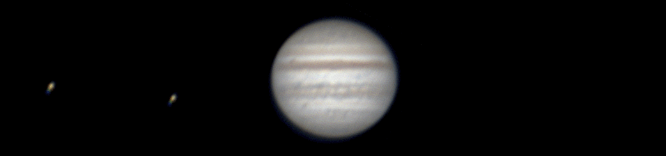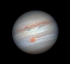 Great Red Spot Transit Notes: One exposure every fifteen minutes. 22 in total. Moons are Io and Europa Telescope: Celestron CPC 800 (8") Barlow: Orion 2x Shorty Plus Camera: Celestron NexImage Each Exposure: Stack of 600-800 x 1/5 s @ 5 fps Date: July 1-2nd July 2008 Time: 10:45 pm to 4:00 am |
