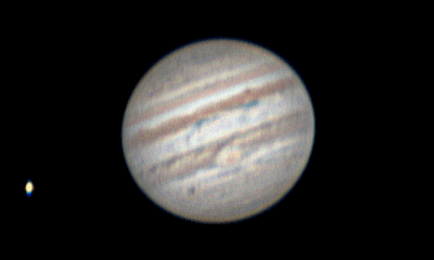 Notes: 3 frame animation of Europa, Ganymede coming out occultation, and Jupiter featuring Europa's shadow and GRS Telescope: Celestron CPC 800 (8") Barlow: Orion 2x Shorty Plus Camera: DMK 21AU04 with Orion RGB Filters Exposure: Stack of 400R @ 1/13s, 468G @ 1/23s, 557B @ 1/19s Pickering Seeing Rating: 4-5 Apparent Mag: -2.83 Distance: 4.0523 AU Date: 2nd August 2009 Time: 0:32, 0:37 & 0:44 am |