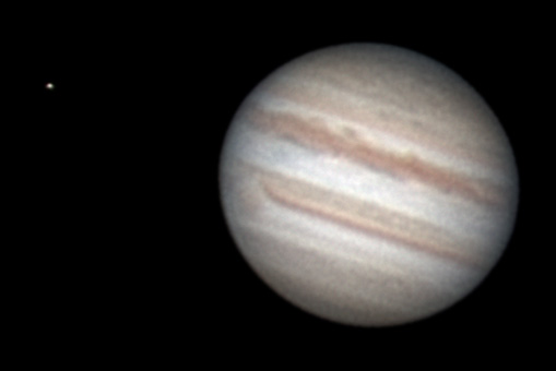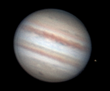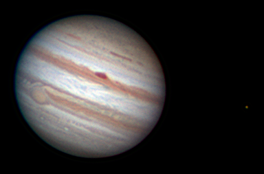 Notes: Jupiter and Europa. The recent impact cloud is the dark mark near the south pole link Telescope: Celestron CPC 800 (8") Barlow: Orion 2x Shorty Plus Camera: DMK 21AU04 with Orion RGB Filters Exposure: Stack of 666R @ 1/23s, 918G @ 1/45s, 900B @ 1/45s Pickering Seeing Rating: 2-3 Apparent Mag: -2.80 Distance: 4.0854 AU Date: 26th July 2009 Time: 1:45 am |