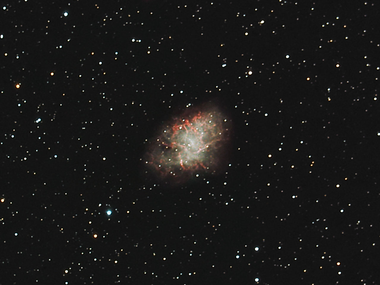 Note: On the outside of this frame I also captured a transiting asteroid: 19 Fortuna Click here to view animation Object: Supernova Remnant Constellation: Taurus Apparent Magnitude: 8.4 Est. Distance: 6500 ly Telescope: Celestron CPC 800 EQ Mount (with Wedge) with f/6.3 Focal Reducer Camera: QHY-8 Filter: 2" Hutech IDAS Light Pollution Suppression Exposure: 21x300 sec (1h 45 mins) Guidescope: Orion EON 80mm ED Guider: DMK 21AU04 with PHD Guiding Date: 18th October 2009