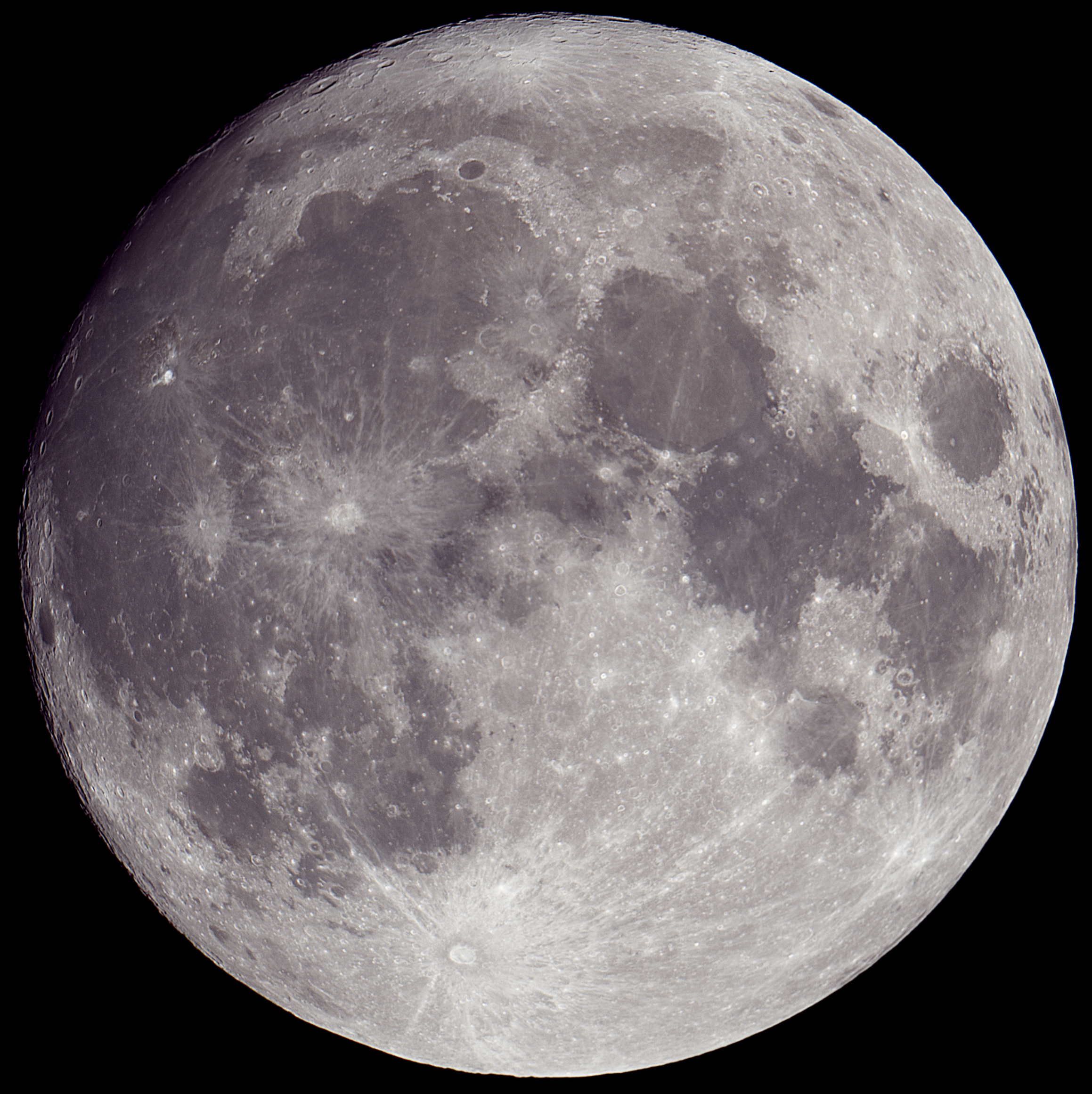 Moon Age: 13.92 days old Each Exposure: 100 x 1/1000 stacked, 25 dark frames stacked and removed with Maxim DSLR ISO: 1600 Final Result: Stitch of 2 separate exposures (to cover the full Moon) with Photoshop Date: 18th May 2008 Time: 10:35 pm CST Telescope: Celestron CPC 800 (8") Camera: Nikon D70