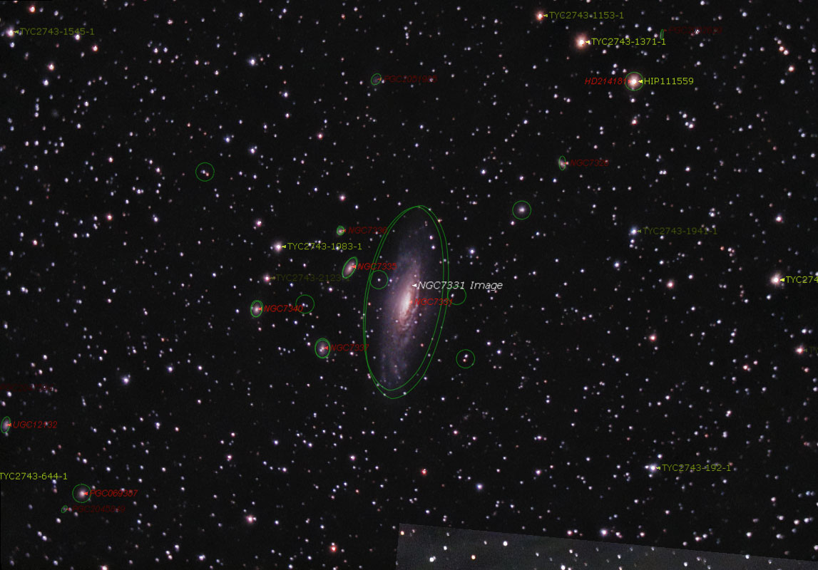 Notes: Size reduced 50%. The background galaxies are about one tenth the apparent size of NGC 7331 and so lie roughly ten times farther away