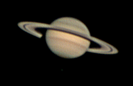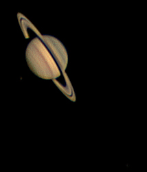 Note: Taking into account that the maximum useful magnification of the scope is 480X, and shooting at f/50, the result is not too bad. Seeing was good but well past 2008 opposition... Rhea can also been seen. Telescope: Celestron CPC 800 (8") Barlow: Powermate Televue 5x Camera: Celestron NexImage Date: 29th May 2008 |