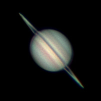 Note: First attempt of compositing Luminance and Chrominance from two different cameras. This is as perpendicular as the rings can be seen until 2038. Telescope: Celestron CPC 800 (8") Barlow: Orion 2x Shorty Plus Camera: DMK 21AU04 (Luminance) and Celestron NexImage (Chrominance) Exposure: Stack of 400 x 1/5 s @ 5 fps Overlaid in Photoshop Apparent Magnitude: 0.96 Distance: 8.9944 AU Date: 1st Jan 2009 Time: 5:09 am Site: Irving, TX |