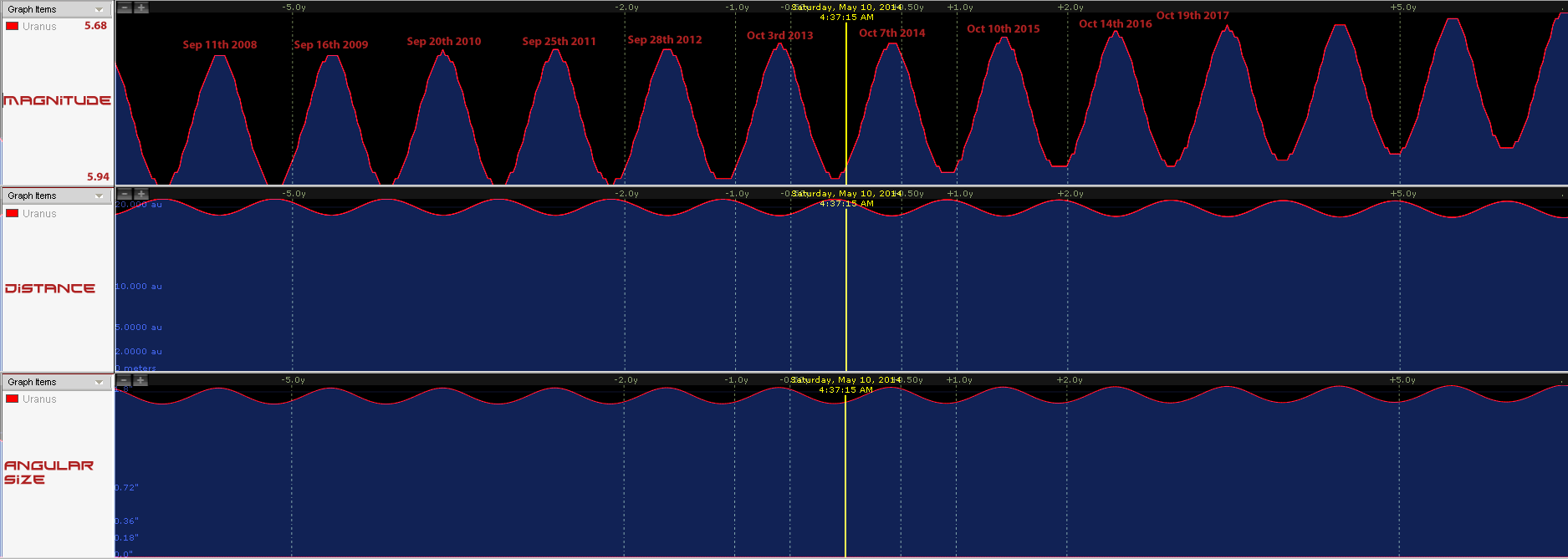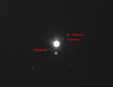 Miranda and Ariel are not seen as they're in front of Uranus. Mag: Umbriel: 15.16, Uranus: 5.88, Oberon: 14.29, Titania: 14.09.